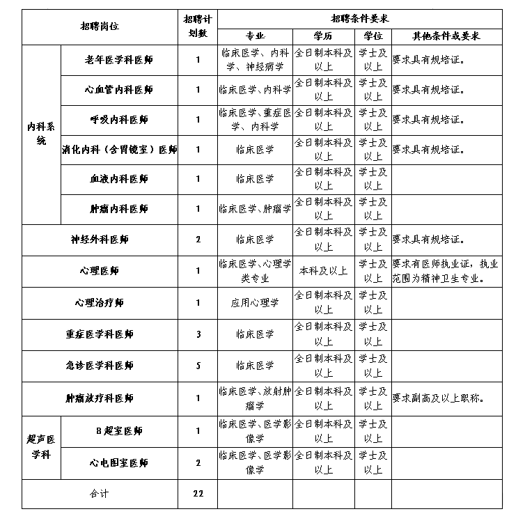 注:初中級職稱應聘人員原則上年齡要求為35周歲及以下;如為副高以上職稱,年齡可放寬至45周歲;學歷層次高者優(yōu)先。醫(yī)師崗位中如要求具有規(guī)培證條件的是指已取得規(guī)培合格證書(含通過規(guī)培結業(yè)考試未領合格證書)或已取得中級及以上職稱人員。