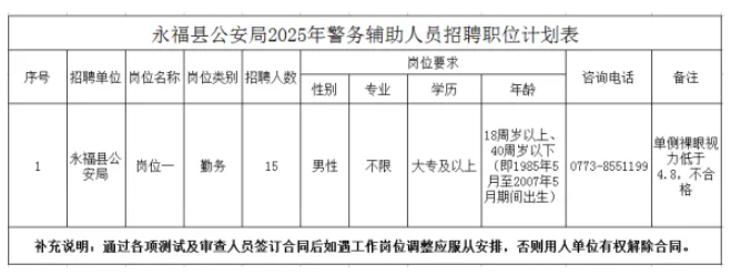 計劃招聘警務輔助人員15名。具體崗位、招聘人數(shù)、資格條件詳見《永福縣公安局輔警招聘計劃表》。