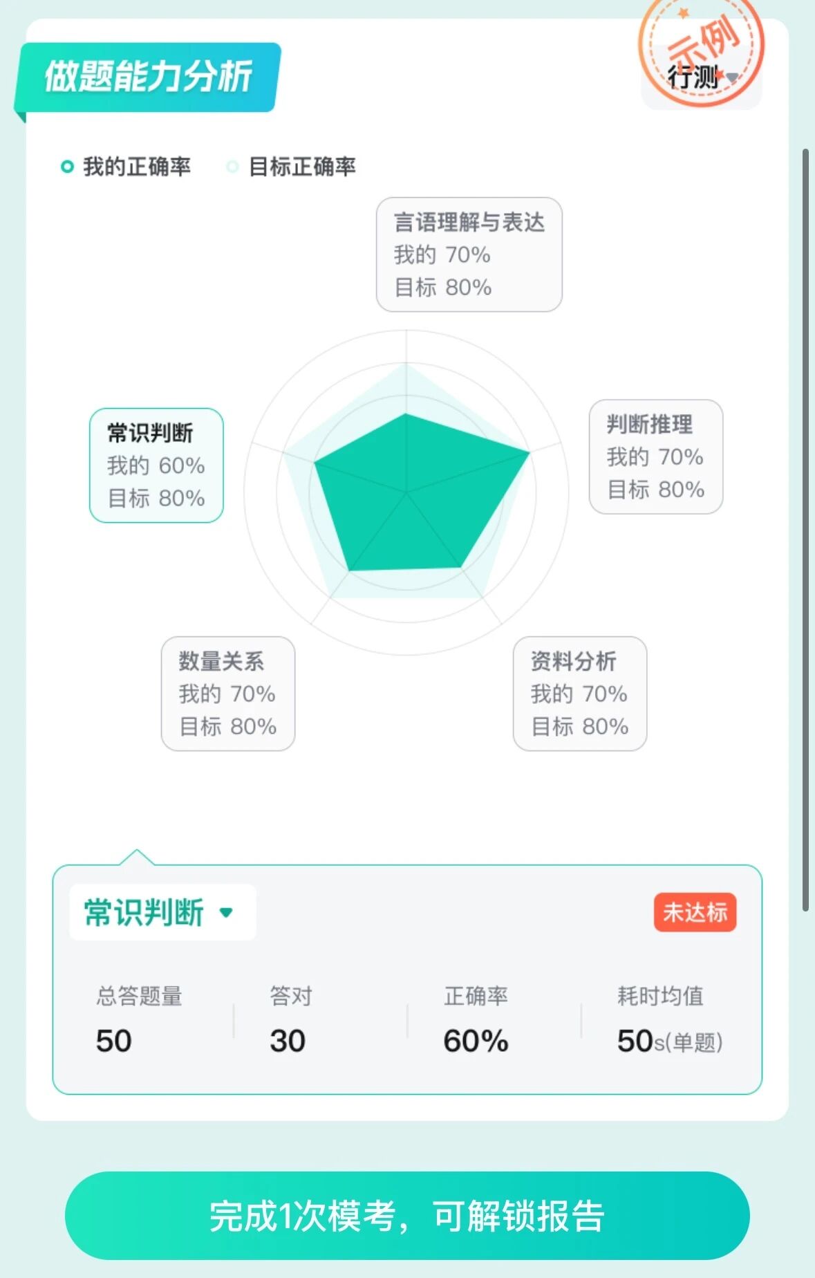 3??生成個人??紙蟾妫?/span>考完就能查看??汲煽?、排名及解析,生成的個人模考報告包含各模塊正確率分布、做題能力分析、筆試分?jǐn)?shù)yu測等內(nèi)容。