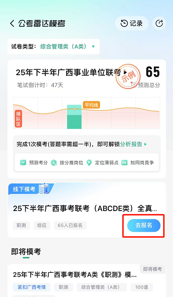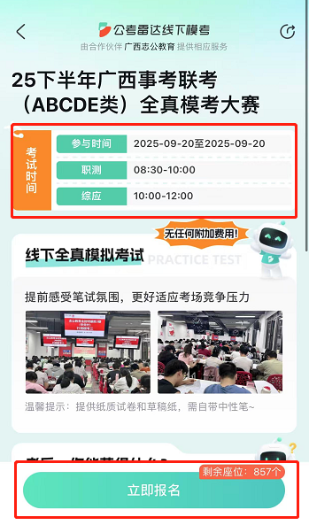 1??全zhen模擬高度還原:嚴(yán)格按照廣西事業(yè)單位聯(lián)考流程和時間進行,試卷對標(biāo)zhen題,考場安排也高度還原,給你沉浸式考試體驗。