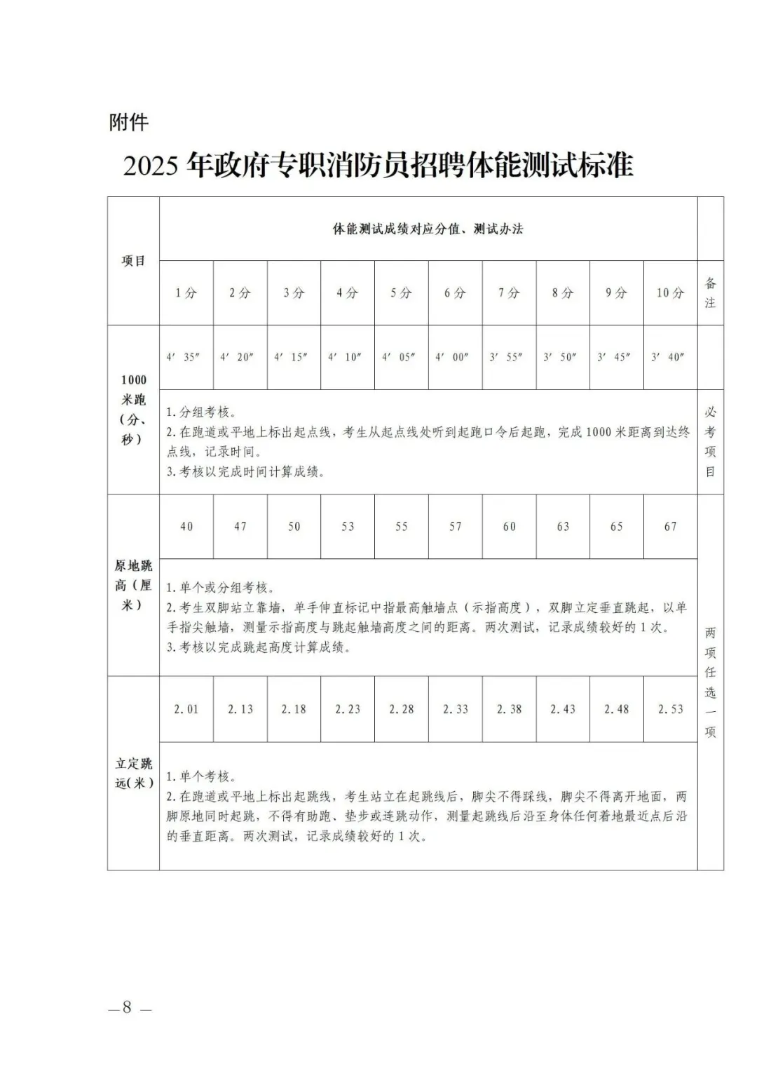 注意事項(xiàng):應(yīng)聘人員須參加體能測試,并當(dāng)場簽訂《天等縣消防救援大隊(duì)政府專職消防員招聘體能和崗位適應(yīng)性測試招聘對(duì)象承諾書》,體能測試有兩項(xiàng)及兩項(xiàng)以上不得分的視為不合格(標(biāo)準(zhǔn)參照附件)。未按時(shí)參加或因身體原因無法測試者,視為自動(dòng)放棄。