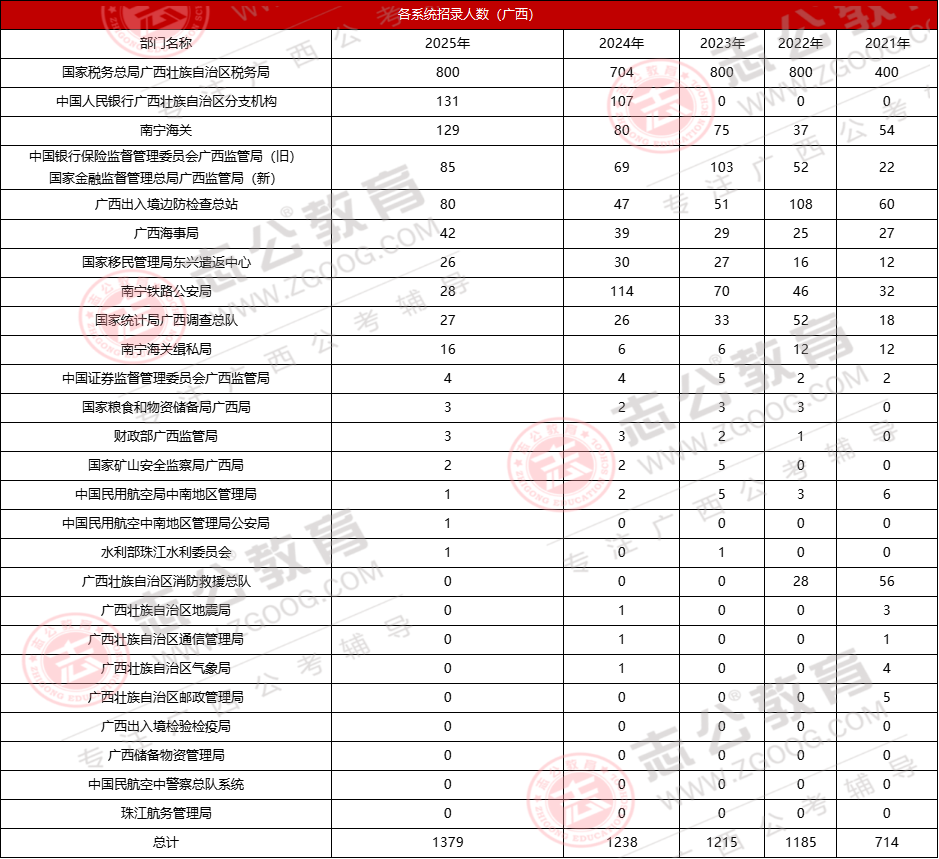 國(guó)家稅務(wù)總局廣西壯族自治區(qū)稅務(wù)局常年占據(jù)招錄首位,2025年以376個(gè)崗位、800人的招錄規(guī)模,占廣西總招錄人數(shù)的58%。此外,海關(guān)系統(tǒng)對(duì)廣西考生較為友好,平均入面分?jǐn)?shù)約117分,比稅務(wù)系統(tǒng)低5分以上,且常面向冷門(mén)專(zhuān)業(yè)招錄,可作為特色選擇。