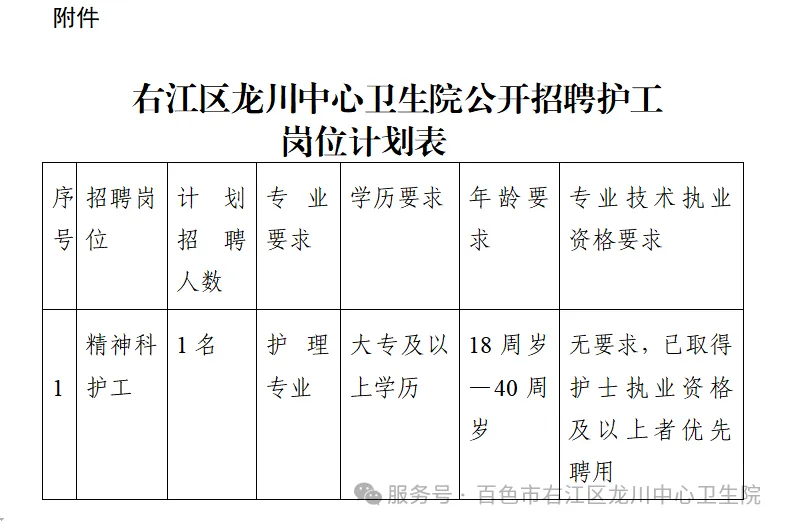 附件:右江區(qū)龍川中心衛(wèi)生院公開招聘護(hù)工崗位計劃表