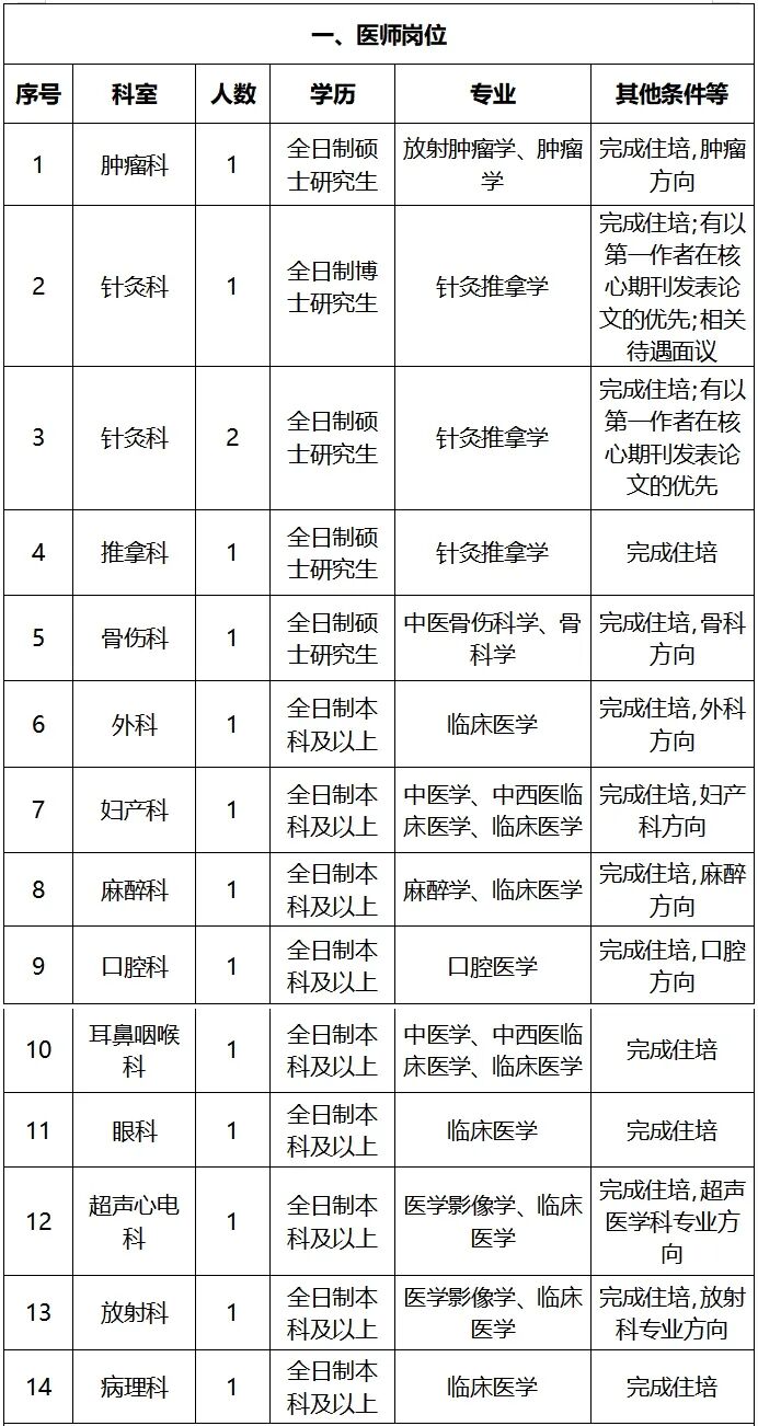 注:2026年應(yīng)屆畢業(yè)生學(xué)歷學(xué)位證必須在2026年7月前取得;要求完成住培的,住院醫(yī)師規(guī)范化培訓(xùn)合格證必須在入職前取得(2026年完成住培的入職前必須通過(guò)國(guó)家組織的住院醫(yī)師規(guī)范化考試)。