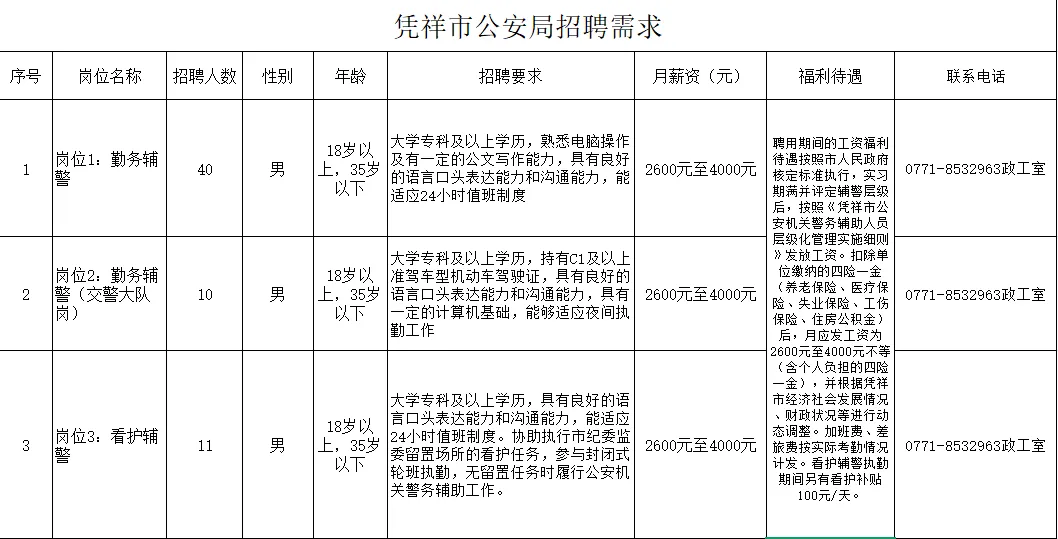 為適應(yīng)憑祥市公安機關(guān)管理工作發(fā)展需要,憑祥市公安局決定面向社會公開招聘61名警務(wù)輔助人員(以下簡稱輔警)。具體事宜如下: