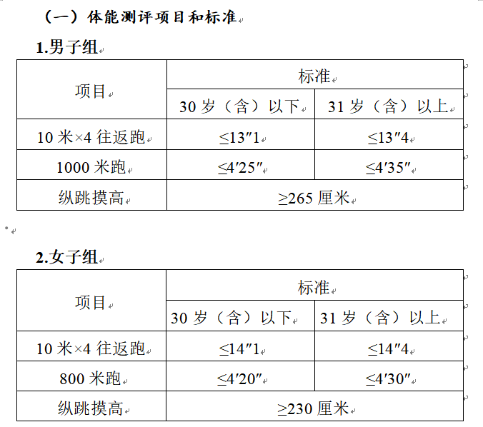 測評(píng)結(jié)果分為合格和不合格。一般體能測評(píng)三項(xiàng)成績均達(dá)標(biāo)的方為合格,其中具有研究生及以上學(xué)歷報(bào)考人員,體能測評(píng)三個(gè)項(xiàng)目中有任兩項(xiàng)達(dá)標(biāo)的,即視為合格。